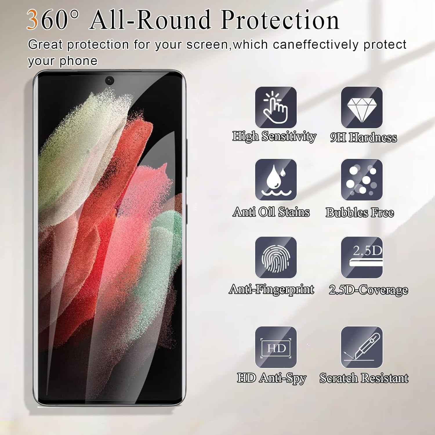 1. Standard design: This tempered screen protector is compatible with Samsung S21 Ultra,made of high-quality composite materials, and uses precise laser cutting technology and exquisite polishing, precise hole position, 2.5D round edge design