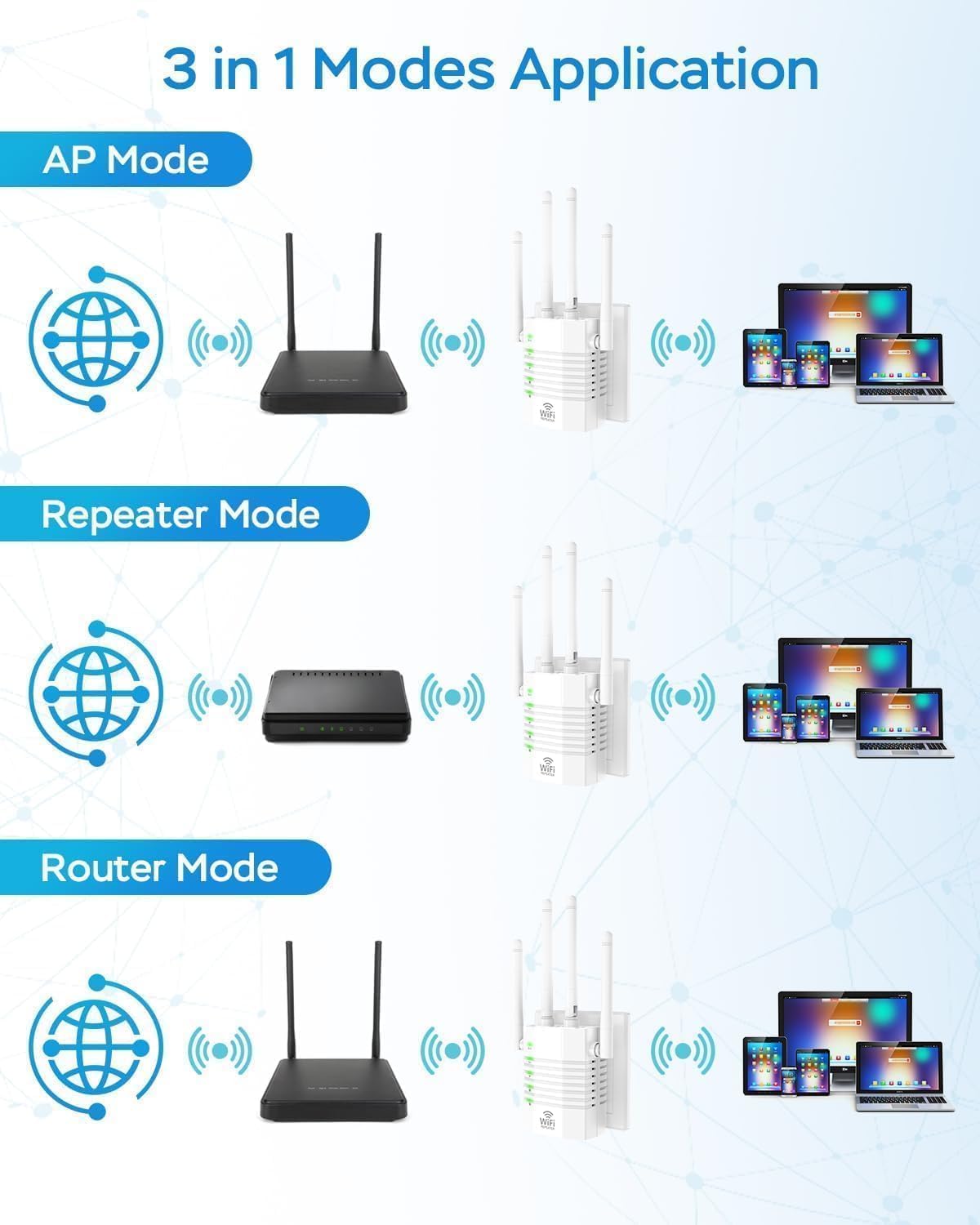 Repeater/AP Mode & Ethernet Port: The wifi extender signal booster is available in 3 modes with AP mode/repeater/2 ethernet ports. Repeater mode is for extending Wi-Fi coverage of an existing wireless network. AP mode is for covering a wired network to a wireless network. Two ethernet ports help connect to any wired ethernet device. This wifi router extender just for meet your different use scenarios and could provide you with a convenient and smooth Internet environment.