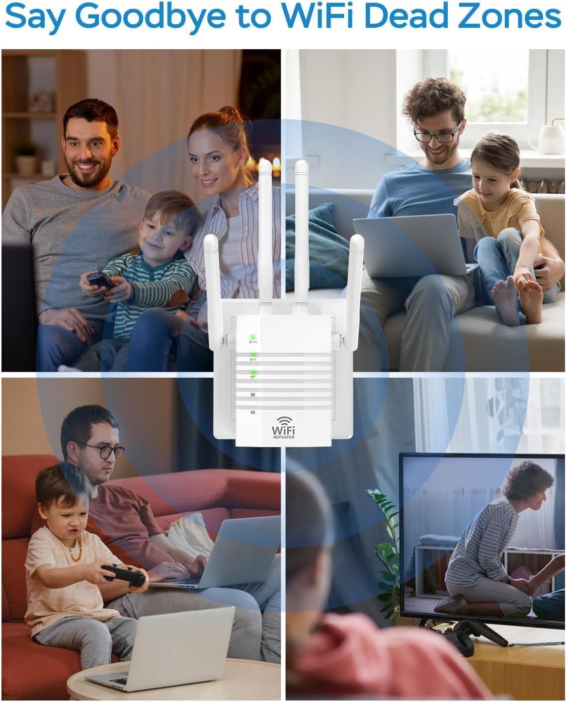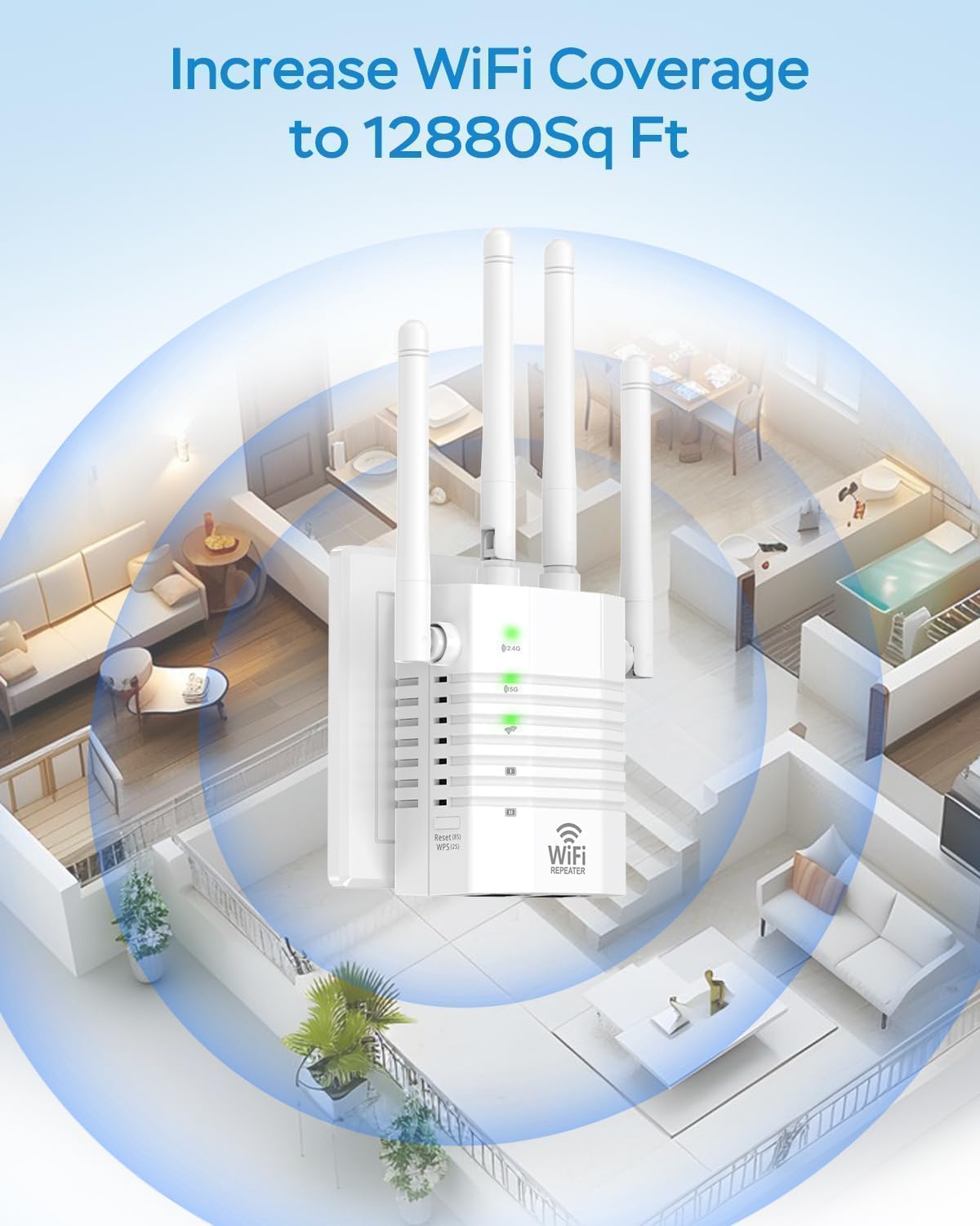 Get 12880 sq. ft Coverage: The wifi range extender is equipped with 4 external antennas, covering up to 12880 sq.ft with higher penetration and no signal loss through walls. From bedrooms, bathrooms, garages, basements to gardens, just enjoy the WiFi signal as you want. Say goodbye to wifi dead zones.