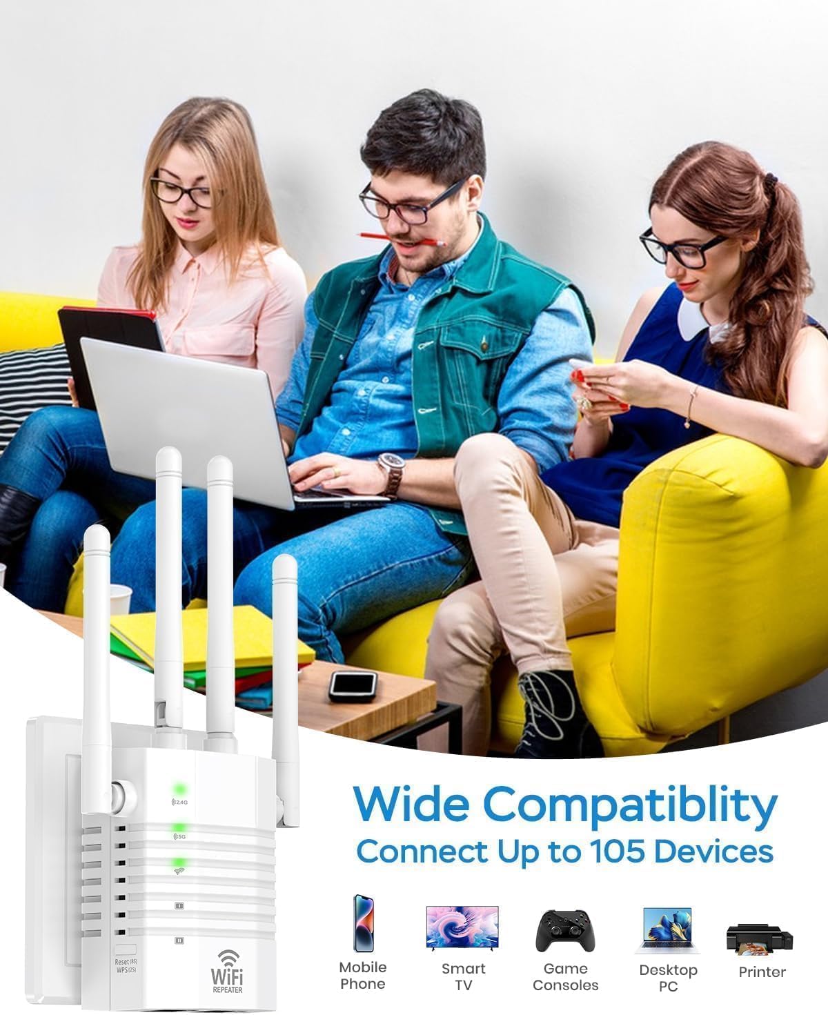 Wide Compatibility: Internet extender, support 105 devices, compatible with mobile phones, tablets, laptop, smart TV, security cameras, printers and other device connections. Wireless extender, provides interference-free, lightning-fast data functions for your home devices. WiFi booster, Easily extend the range of your home WiFi network and keep all your mobile devices connected without having to purchase more equipment.