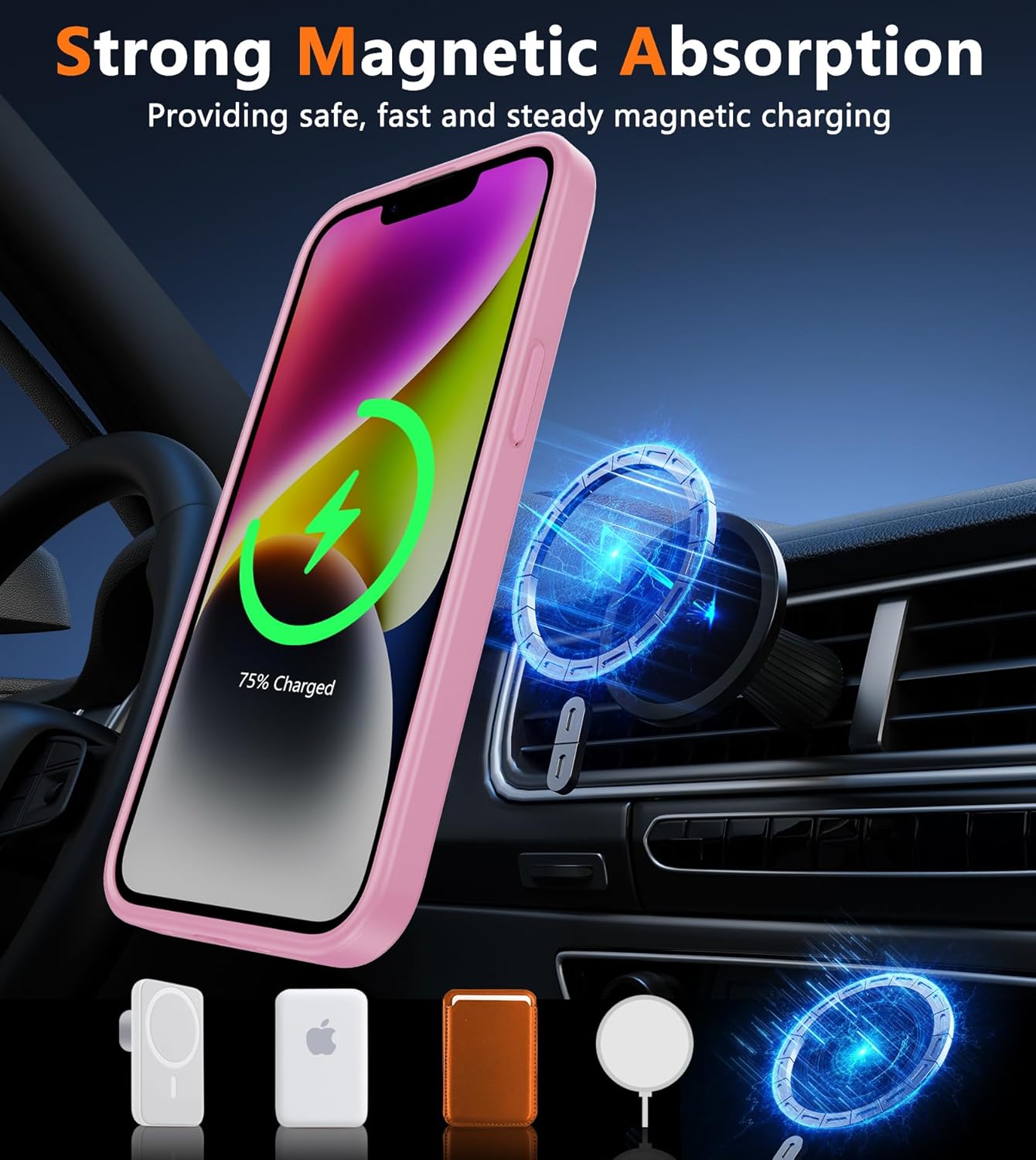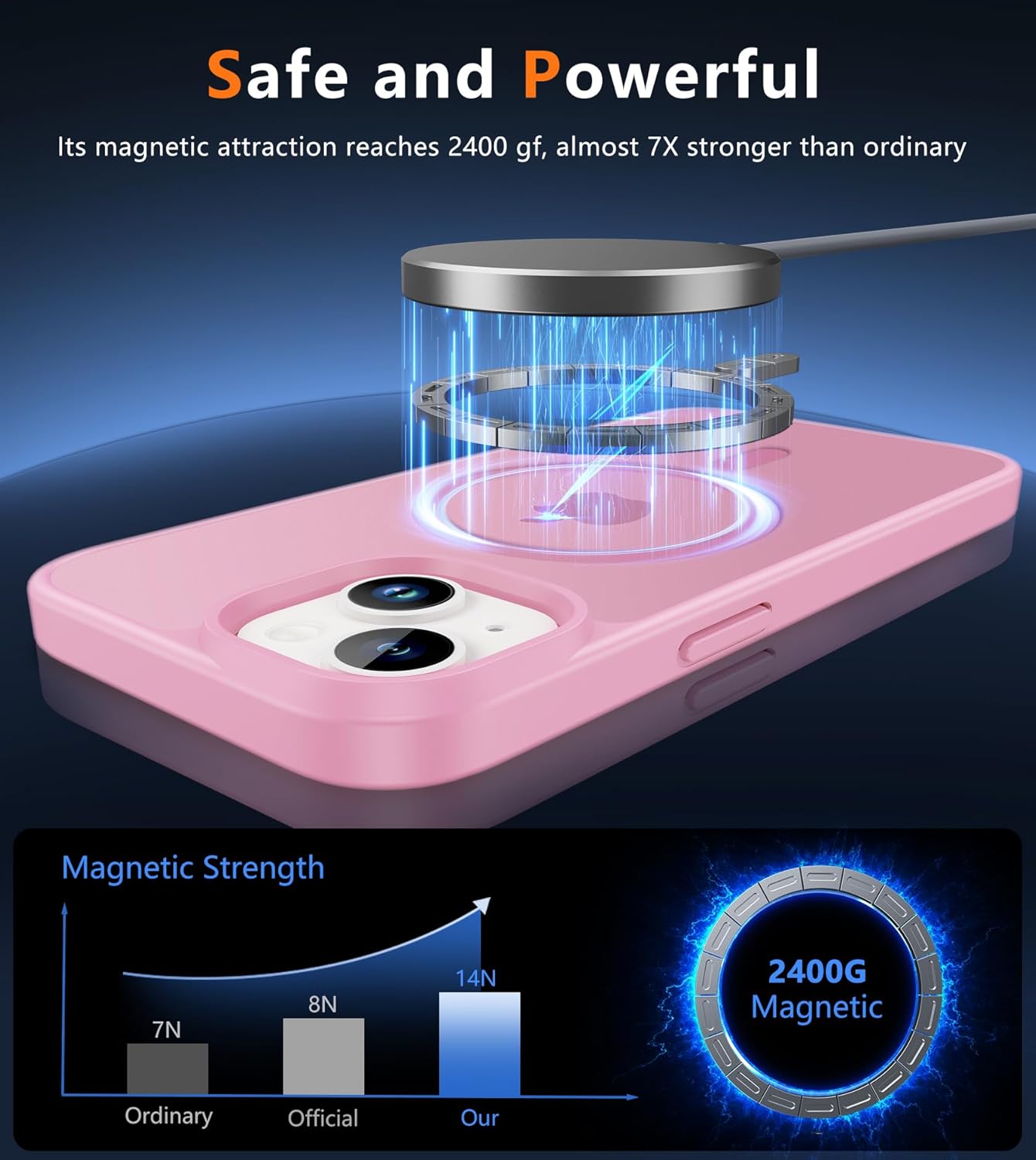 Strong Magnetic Attraction: For Magnetic chargers and other Qi Wireless chargers without signal influence. The iPhone 13/14 magnetic case has built-in 38 super N52 magnets. Its magnetic attraction reaches 2400 gf, which is almost 7X stronger than ordinary, therefore it won’t fall off no matter how it shakes when you are charging