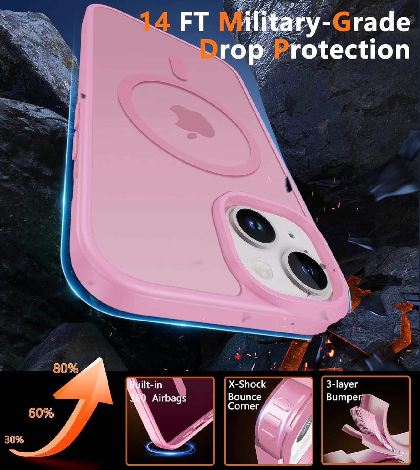 14FT Military Grade Protection: Passed Military Drop Tested up to 14 FT. This iPhone 13/14 phone case backplane is made with rigid polycarbonate and flexible shockproof TPU bumpers around the edge and features 4 built-in corner Airbags to absorb impact, which can prevent your Phone from accidental drops, bumps, and scratches