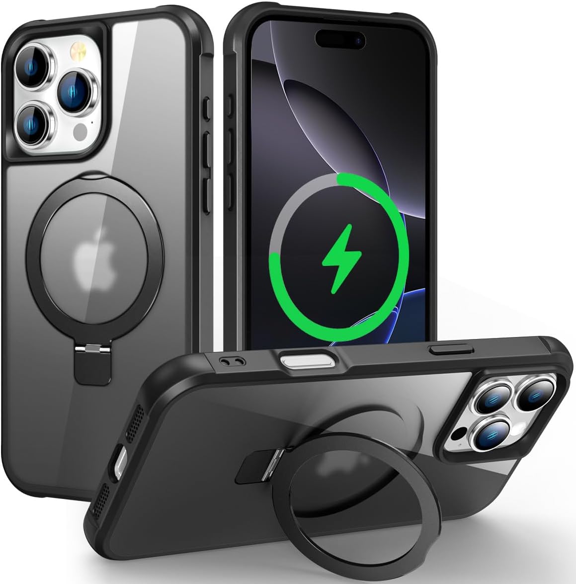 Magnetic Compatible with iPhone 16 Pro Case with Stand [Military Grade Drop Tested][Compatible with Magnet] Ring Translucent Slim Hard Back Soft Edge, Black
