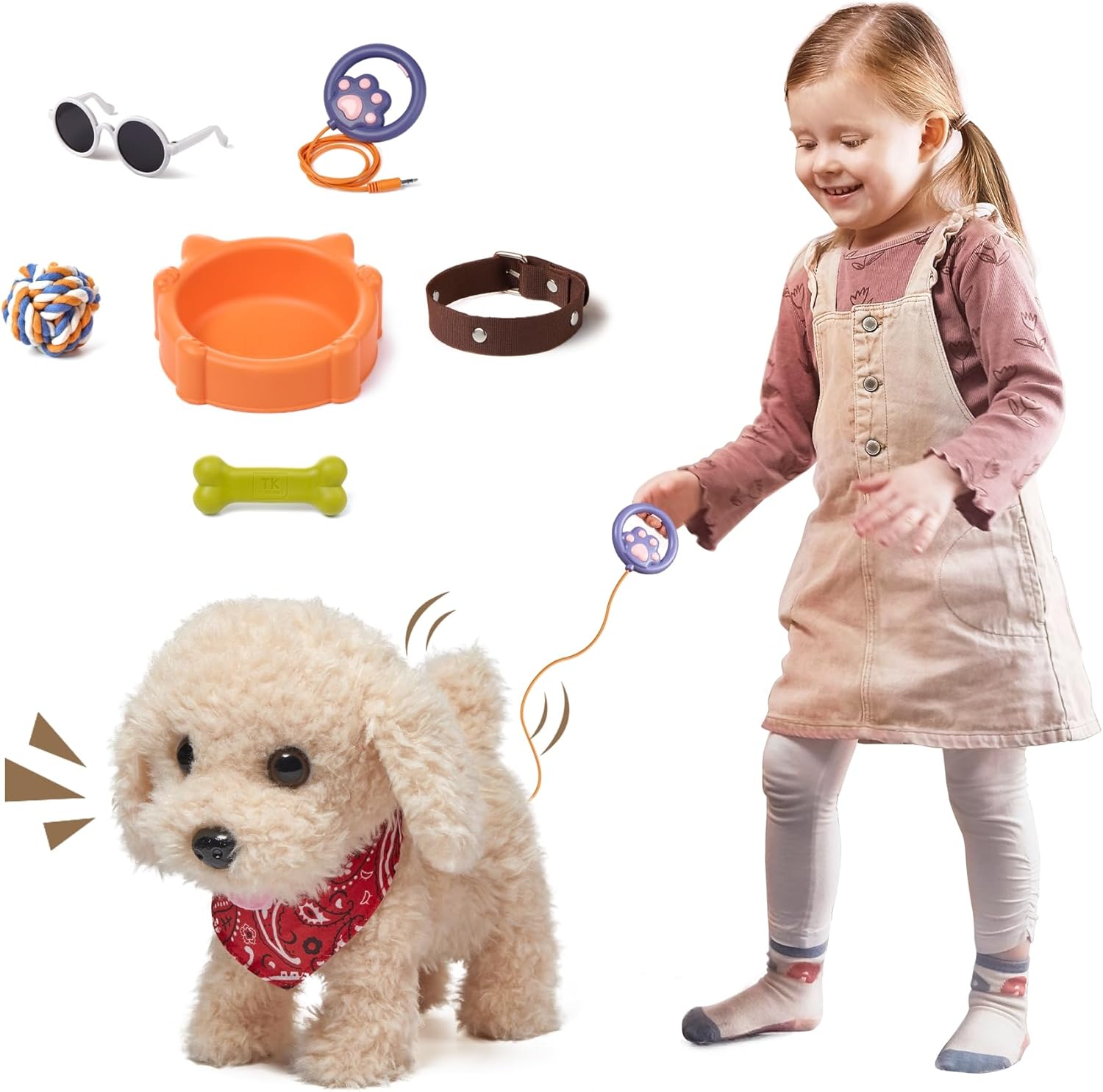 Toy dogs that walk, bark, wag tail and nod head like a real dog would. When you put in the batteries and turn it on, press the button on the handle of the leash, it is fun to see the dog come to life. It walks, wags tails, head and barks. Have fun with your lifelike pet without getting bitten or scratched.