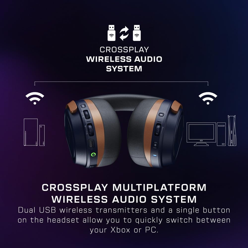 Dual USB wireless transmitters and a single button on the headset allow you to quickly switch between your favorite console or PC without having to move transmitters or connect cables.